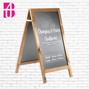 Double-sided square tabletop wooden chalkboards with a natural wooden stand.